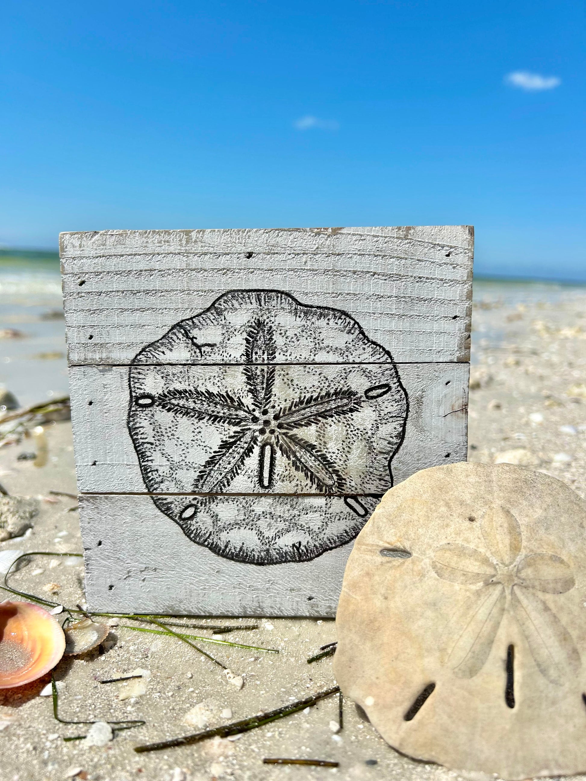 6" x 6" x 2" Wooden Sand Dollar wall art. Hand drawn on a rustic wooden box, and finished with a flat primer to preserve the work. This piece can stand on its own, making it great for table displays or counter top decorations. Additionally a rope hanger and plastic hanger come mounted on back if you chose to hang it from a wall.