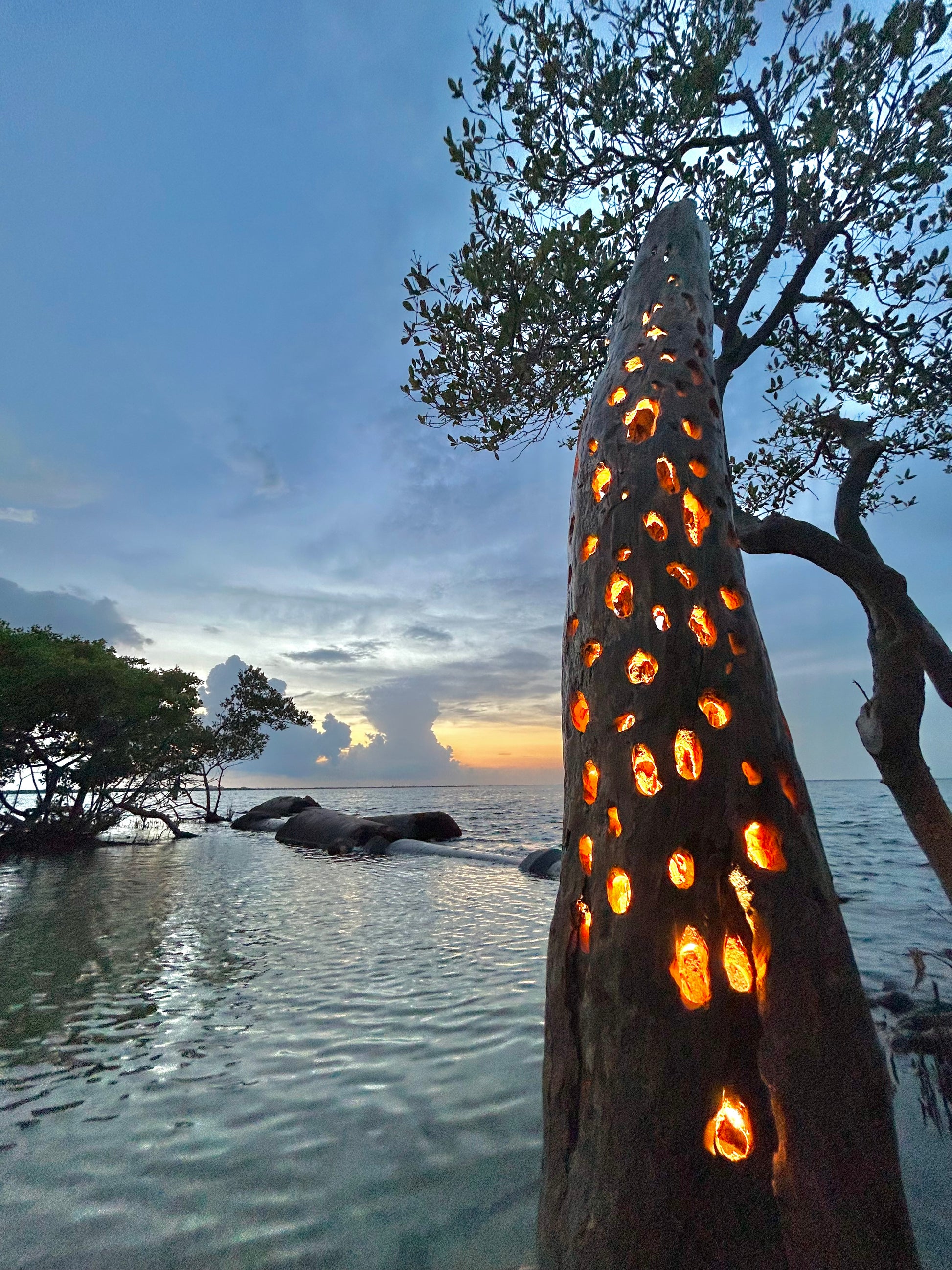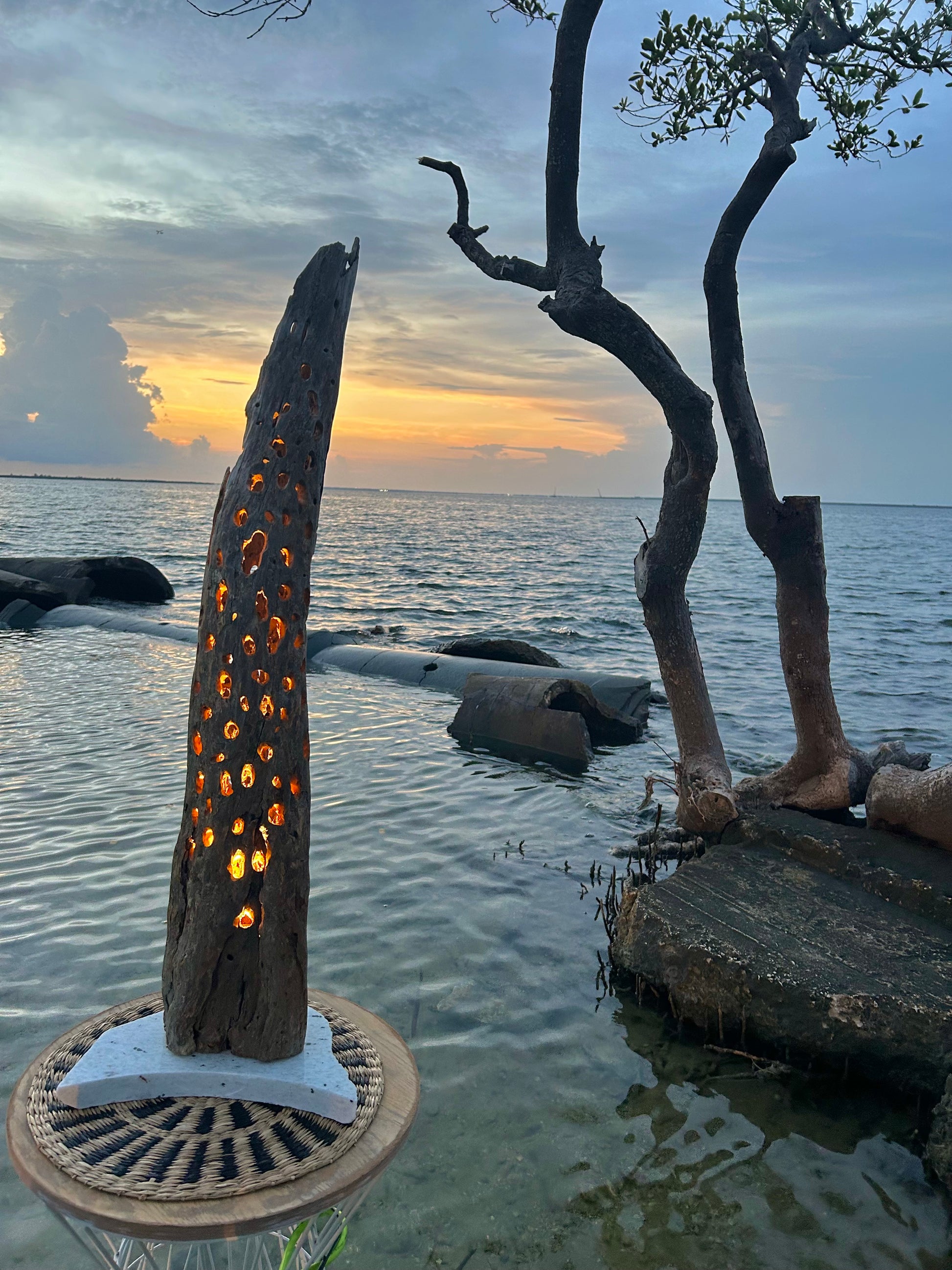 Locally collected in the Tampa Bay area, this hallow log was transformed into a beautiful floor lamp. A warm bulp makes this piece a cozy addition do your home's ambience. White recycled marble makes up the base of this piece giving it a tastefull contrast between natural rustic and clean modern. It stands roughly 3' tall and a foot wide at the base. The lamp is powered by a hard wired plug and LED bulb to ensure batteries do not need to be swapped out or re-charged.