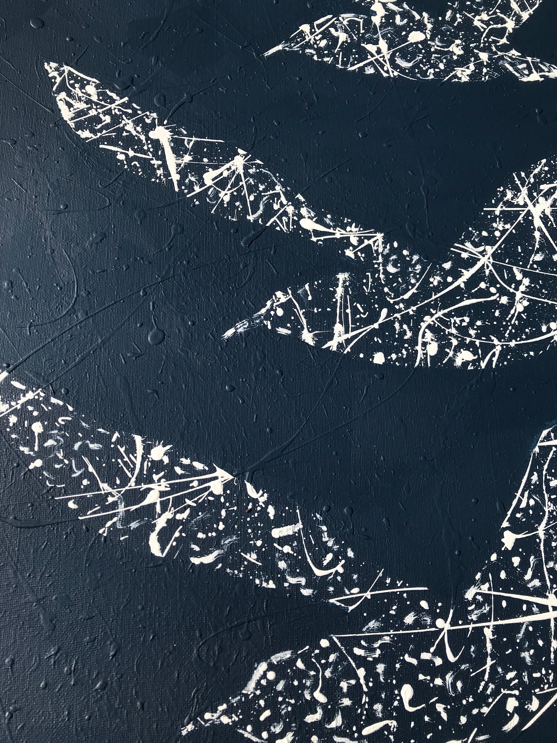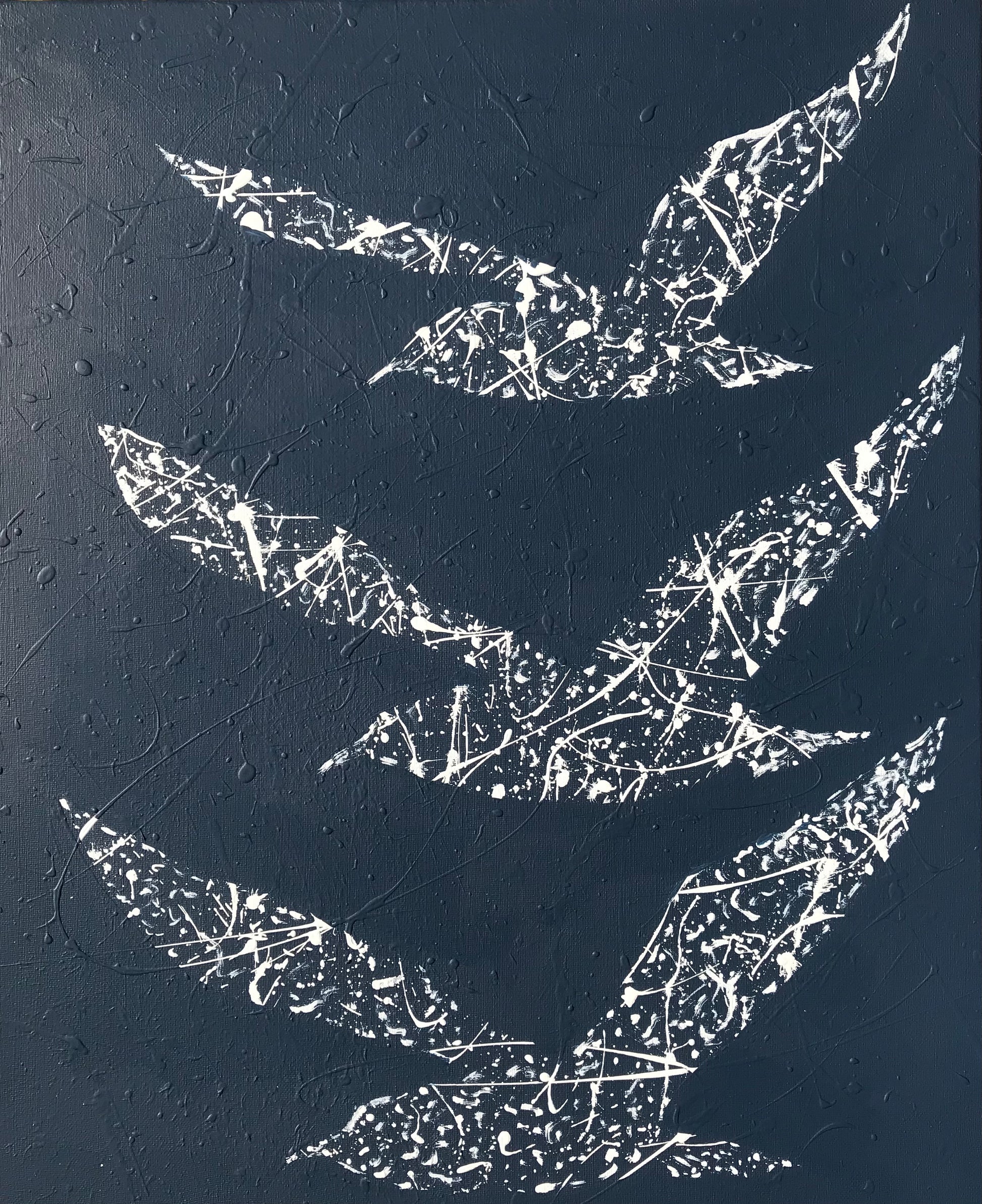 This 20" x 24" canvas was created with acrylics and spray paint. "Flight" is a simple piece containing 3 sea birds shown in a splatter paint fassion. Great for any room, especially those looking for nautical accents in their home. As always this is a 1 of 1 original by myself.