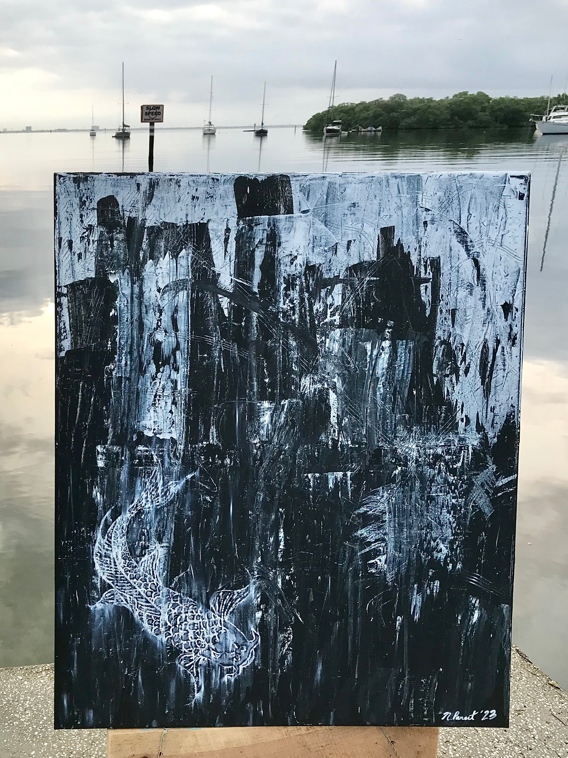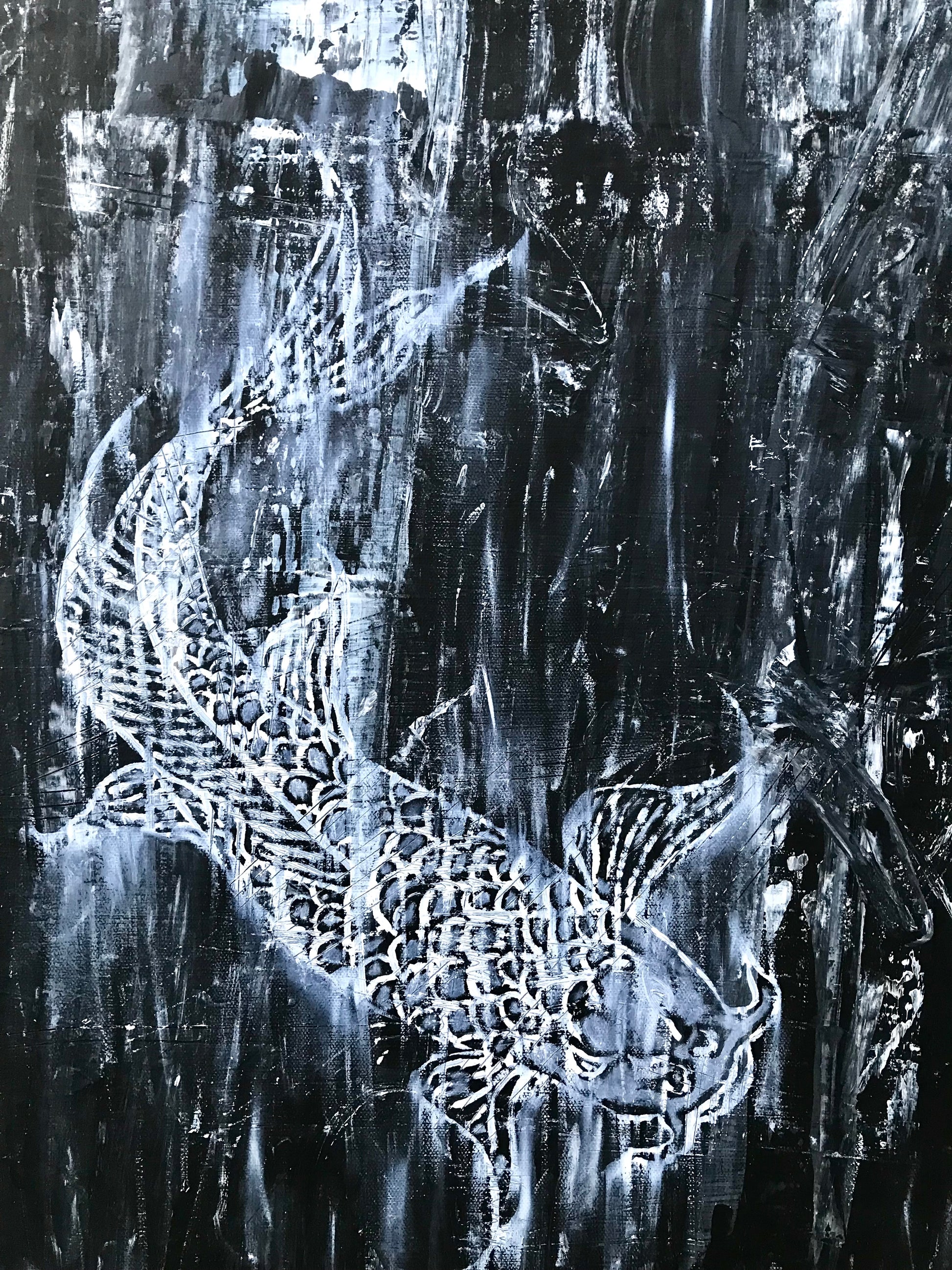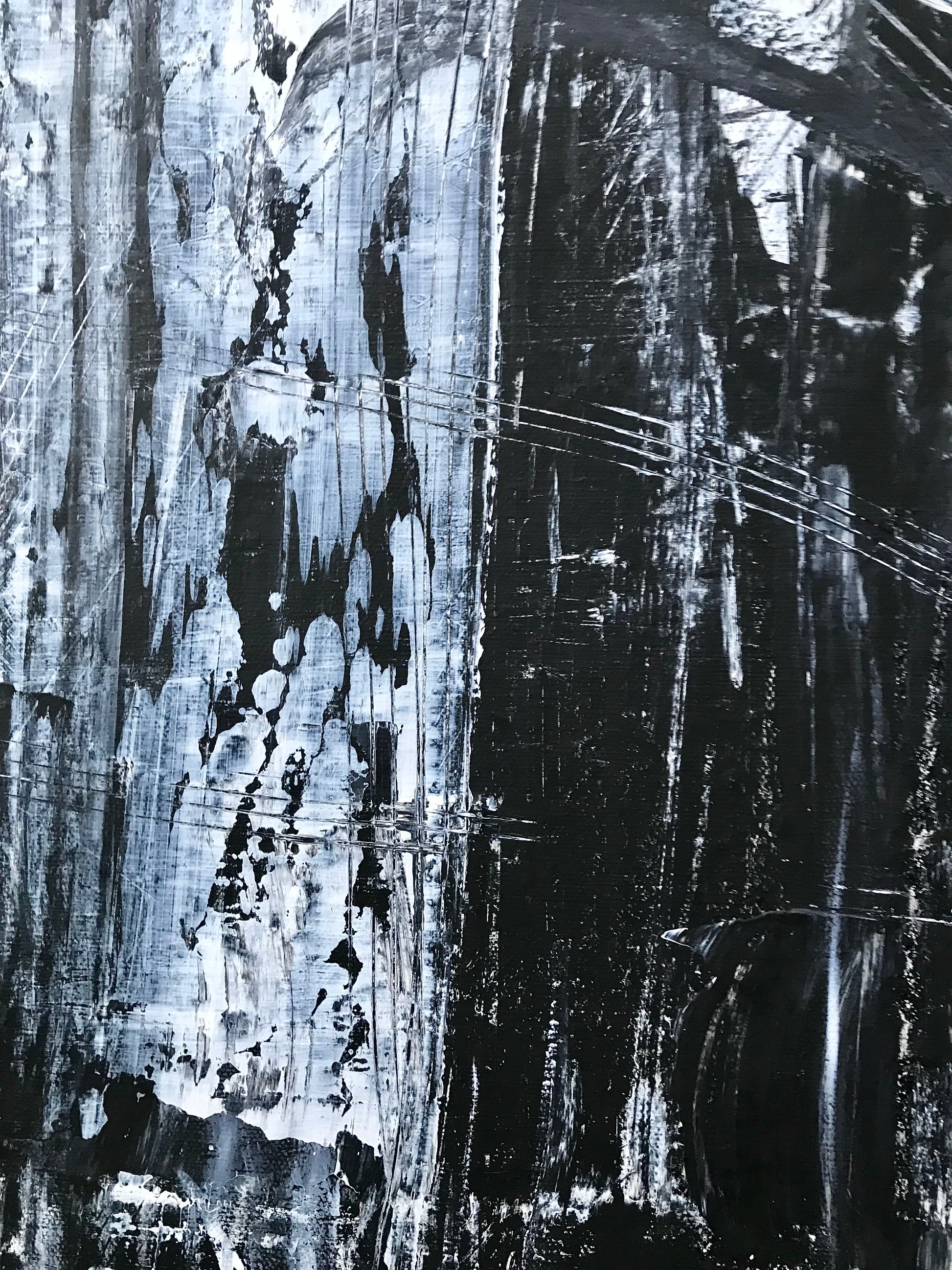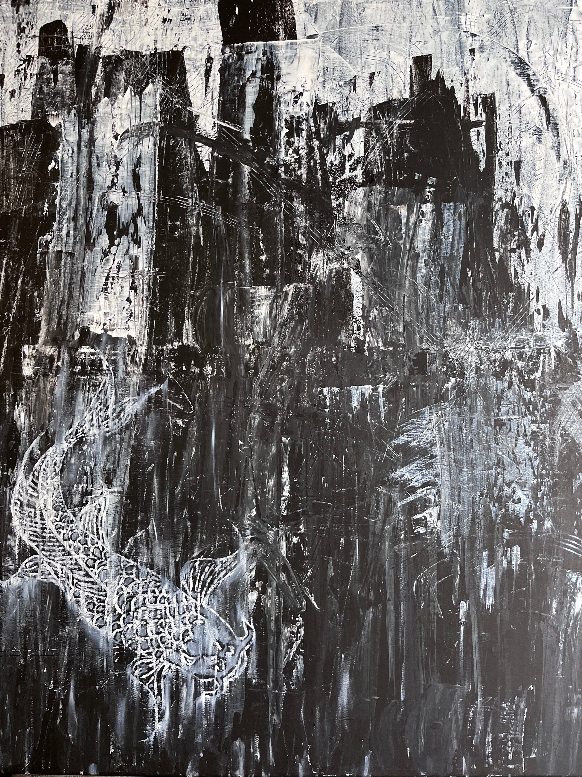 "Koi" - An image usually associated with peace and calming scenery. Instead, in this piece it is paired with a bit of chaos and monochrome simplicity. I find that most of my days go a little something like this painting, a bit of peace and calming moments mixed in with chaos and confusion. This piece can fit a wide range of home decor styles such as mid-century modern, rustic, industrial, contemporary, japandi and more. The painting is done on a 30" x 36" canvas with acrylic paints.