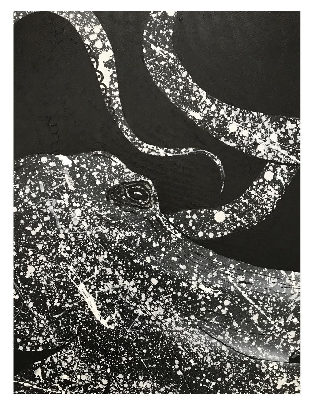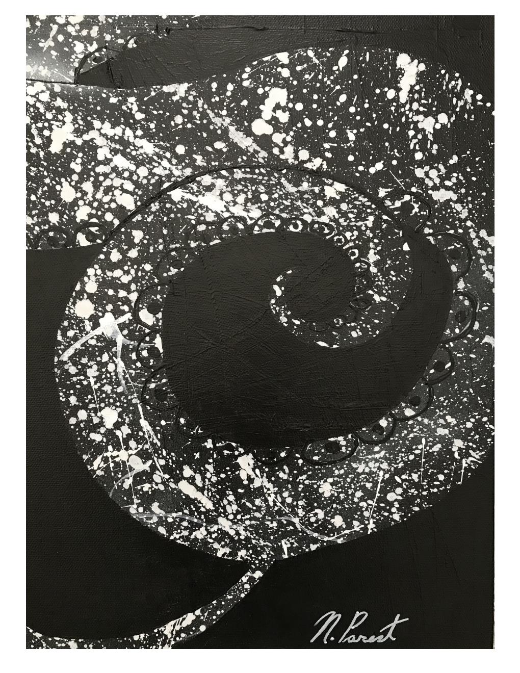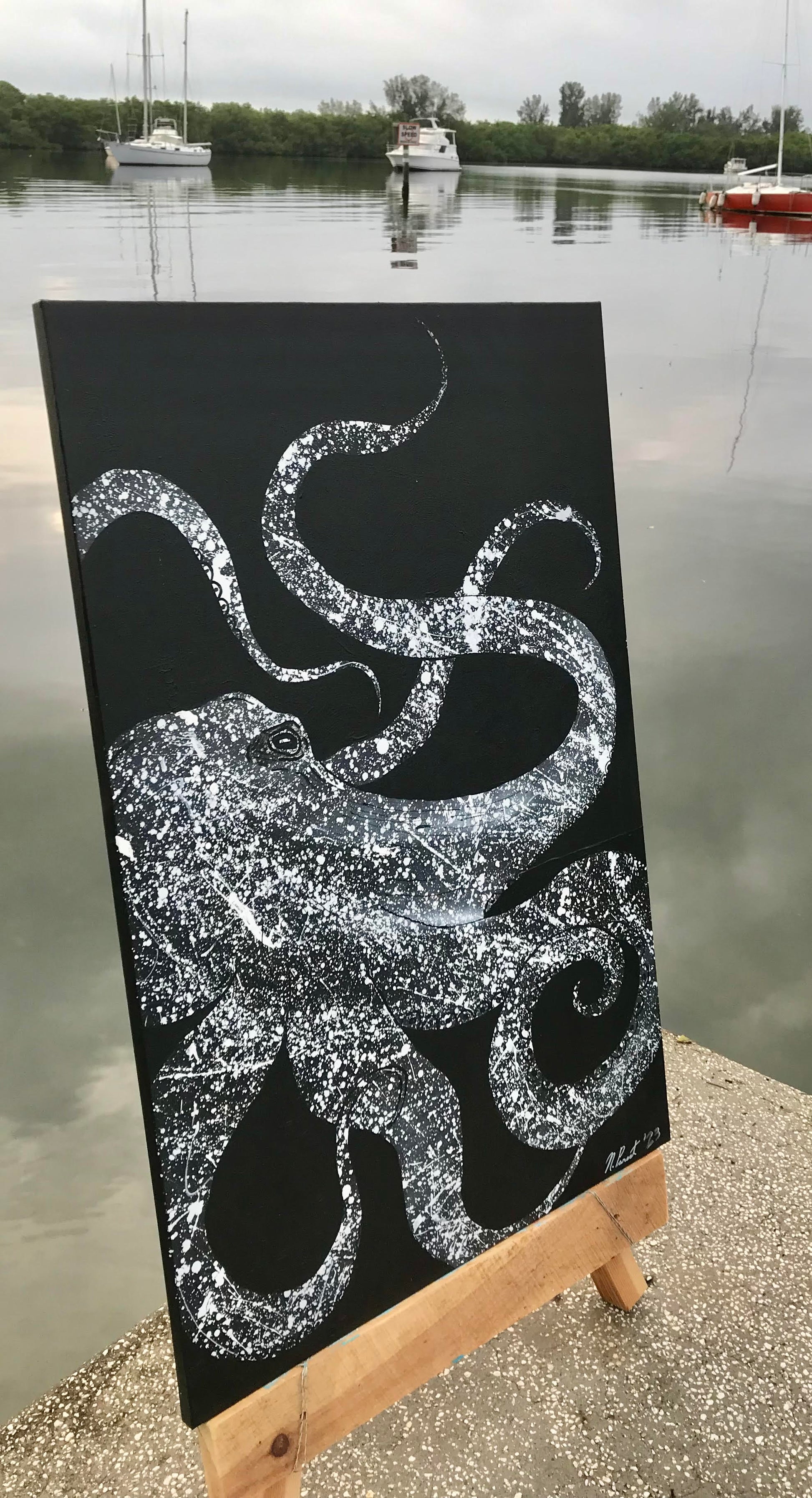 This original 24" x 36" canvas is an acrylic piece based on my take on the classic "Kraken" sea creature. The sporatic and hectic paint work captures the oceans energy while the black background keeps this piece simple and grounded. This piece can work well in any room as the simple black and white coloration help it fit in almost anywhere, creating a nice focal point on the wall. This piece is an original by myself, and can come varnished if you wish to have a glossy shine to match your space.