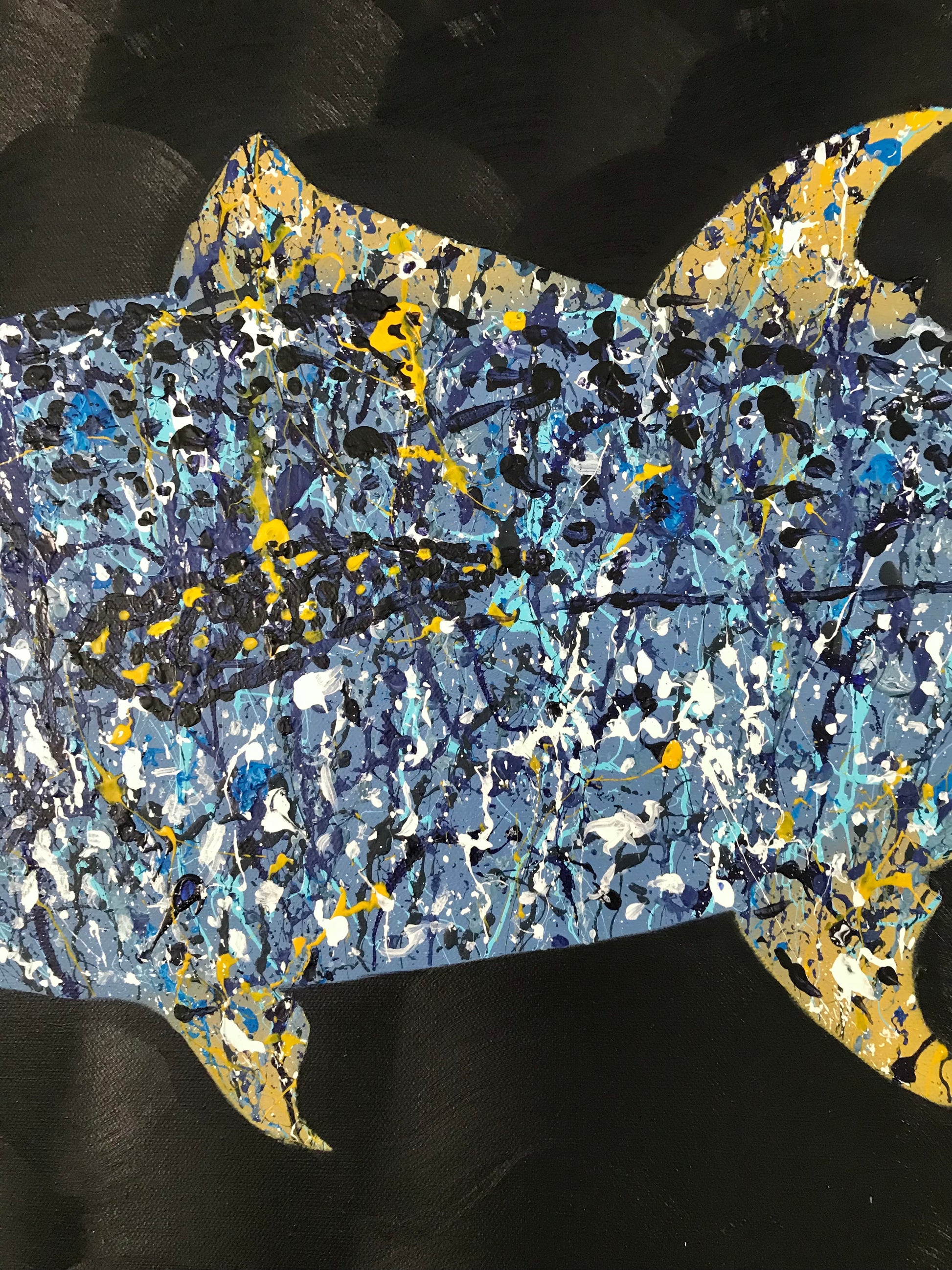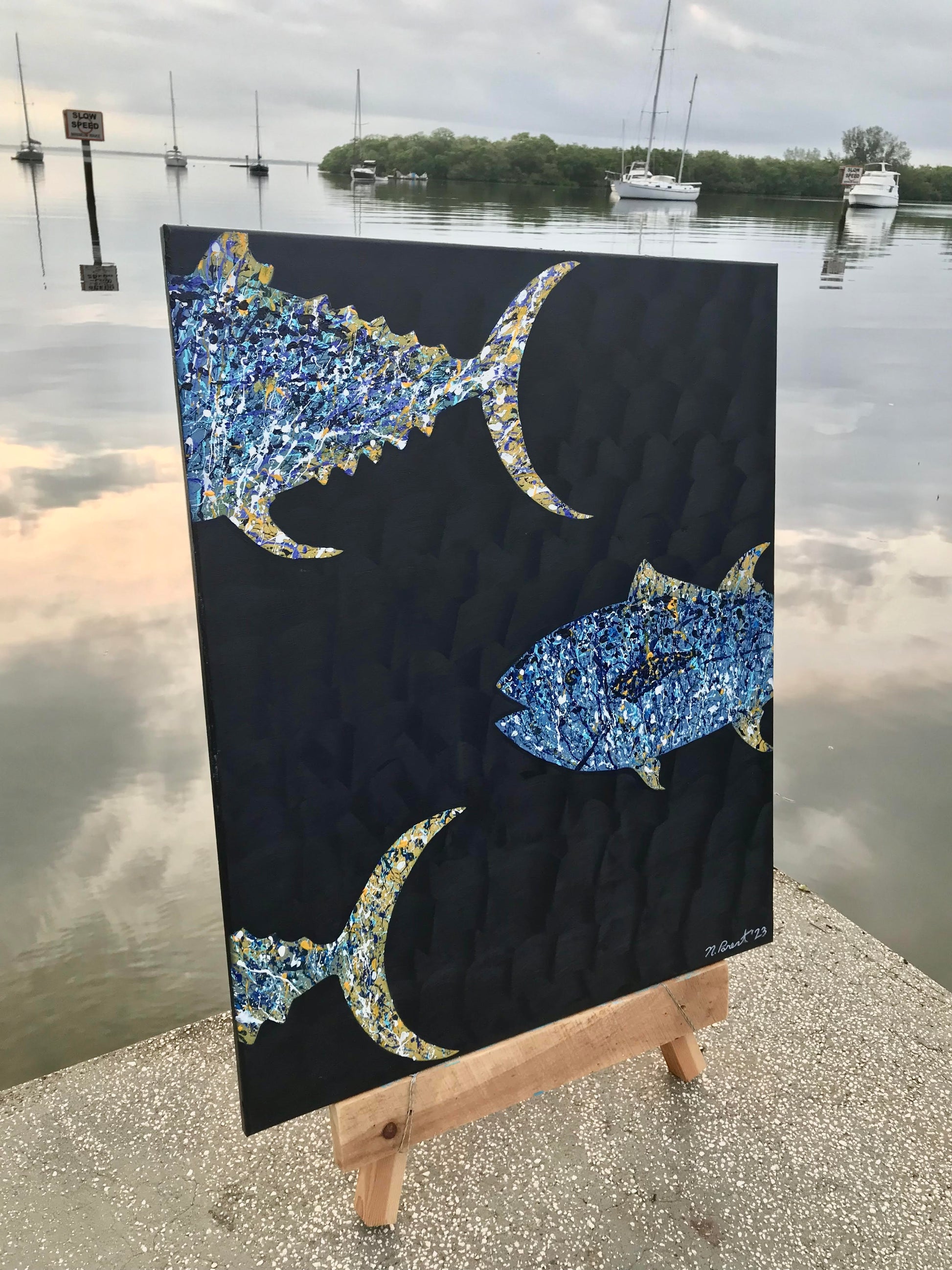 Tuna Time is a 30" x 36" acrylic piece perfect for any fisherman/women or anyone with a nautical or coastal theme in their home. The vibrant splatter colors that make up the tuna help make this pop, while the simple and sleek design keep the piece clean cut.